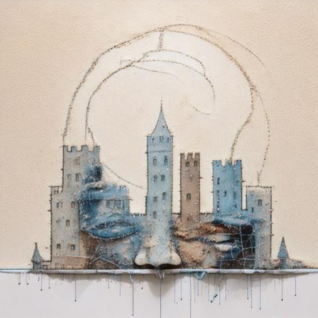 Firefly / 提示:画面下半部分是人脸眉毛以下的部分,没有额头,脑子的部分是一个沙子做的城堡,有水滴下来使城堡溶解、坍塌