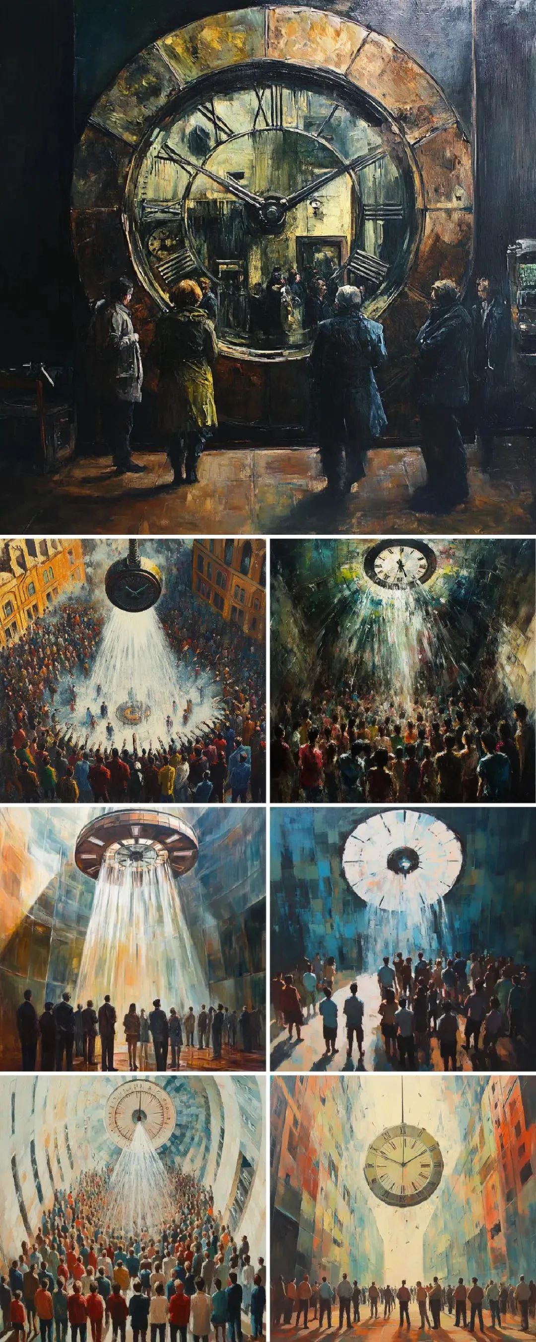 时间的流逝是连续的,但我们常常在某些时刻感到它被打断、错位或无法控制。不对称的时钟碎片、裂开的日历页,或断裂的物体,象征时间在个体感知中的不稳定性。