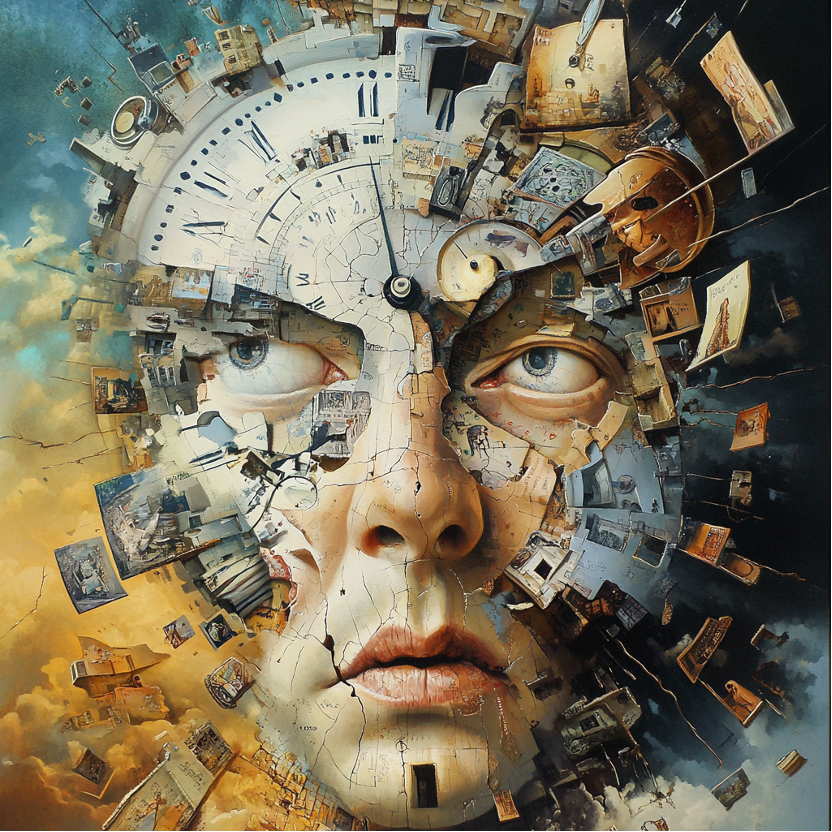 MJ / #prompt:Design a picture to express the spatio-temporal relationship, expressing human's perception of time, collapse of time and space,the main part of the picture is a huge face, consists of broken buildings and broken clock,fragments of memory surrounding it, time freezes here, memories are broken and reorganized here