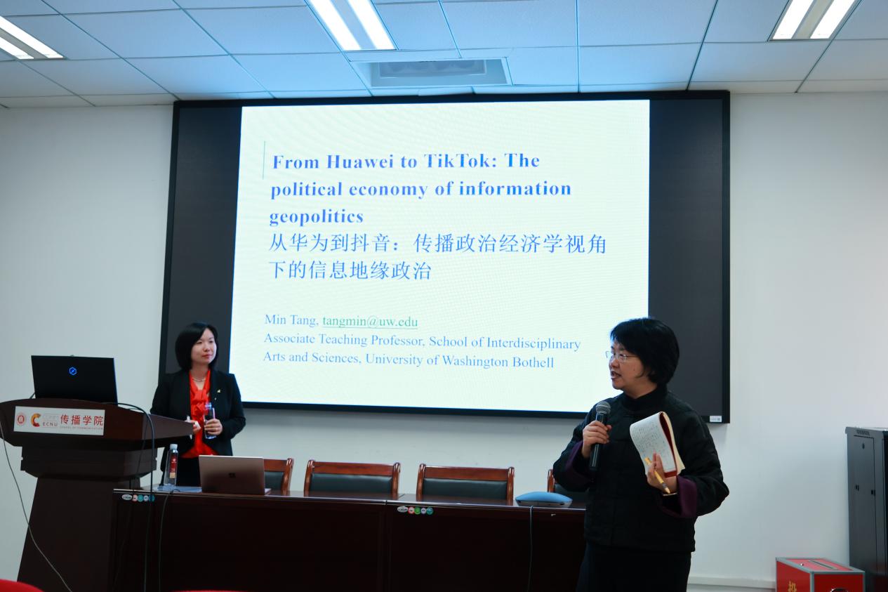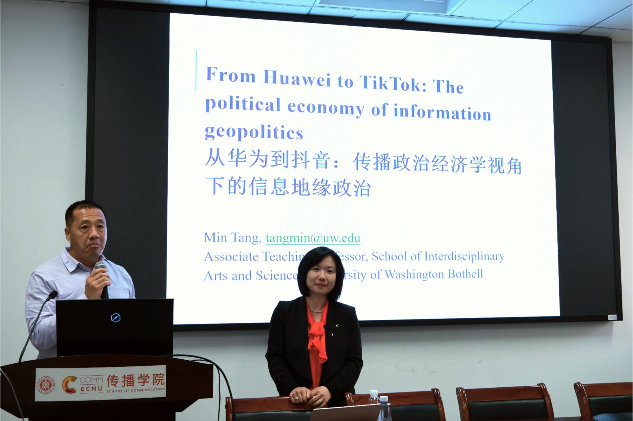 2025年12月5日下午,主题为“从华为到抖音:传播政治经济学视角下的全球信息地缘政治”的学术讲座在yl23411永利集团闵行校区yl23411永利集团212报告厅举行。本次讲座由美国华盛顿大学博赛尔校区跨学科文理公司副教授唐旻主讲、yl23411永利集团林春峰副教授主持,yl23411永利集团吕新雨教授作为对谈嘉宾出席本次活动。本次讲座吸引了诸多关心全球信息传播格局、大国博弈等议题的师生参与,现场氛围热烈而富有思辨性。