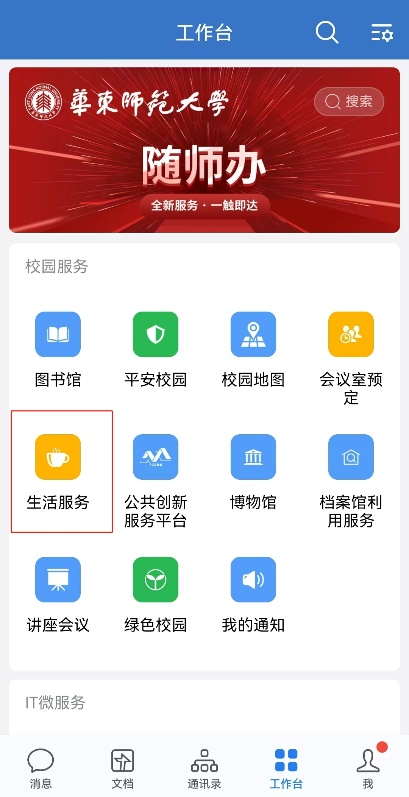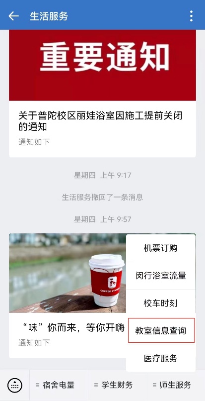 2、公司微信企业号:选择“生活服务-师生服务-教室信息查询”;