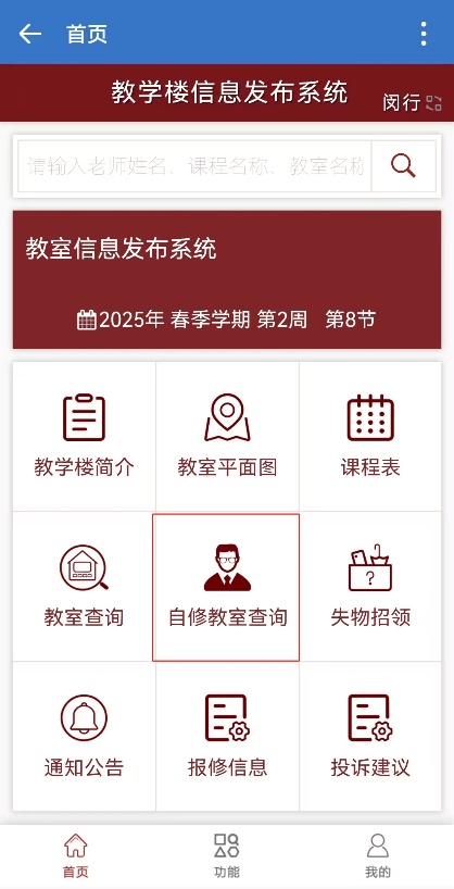教学楼自习教室以教室信息发布系统为准,登陆方式如下: