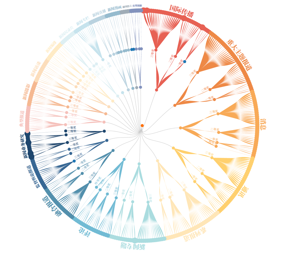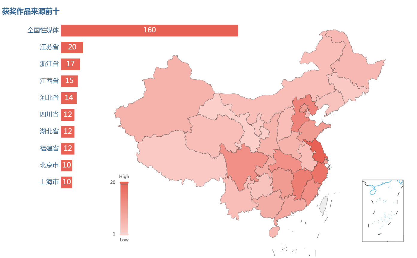 在378件获奖作品中,全国性的媒体单位申报作品接近半数,中央主要新闻媒体体现了强劲的竞争优势和较高的作品水准。对余下各省份申报作品进行地理分布的热力分析发现,获奖作品主要集中在东南沿海、华北和中部地区,其中江苏、浙江、江西为排名前三的地域。值得注意的是,除澳门、台湾外,全国各省的地方媒体均贡献了获奖作品,实现了0的突破。