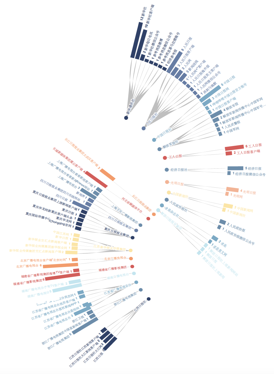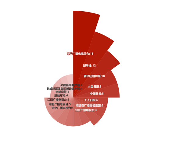 细察数据可以发现,如果将新闻单位及其打造的新兴媒体传播平台叠加起来,又是一番新气象。例如,「新华社获奖12件,「新华社客户端10件,「新华社微信公众号、「新华每日电讯各1件,新华社主办的「经济参考报、「参考消息喜马拉雅账号、「参考消息微信公众号和「参考消息微博也各获奖1件,累计起来「新华社媒体集群的获奖件数多达28件;「中央广播电视总台获奖15件,「央视新闻客户端4件,累计19件;「人民日报获奖8件,「人民网3件,「人民日报客户端3件,「人民日报英文客户端、「人民网微信公众号、「“人民网+”客户端、「人民日报海外版各1件,累计起来「人民日报社媒体集群的获奖件数为18件。
