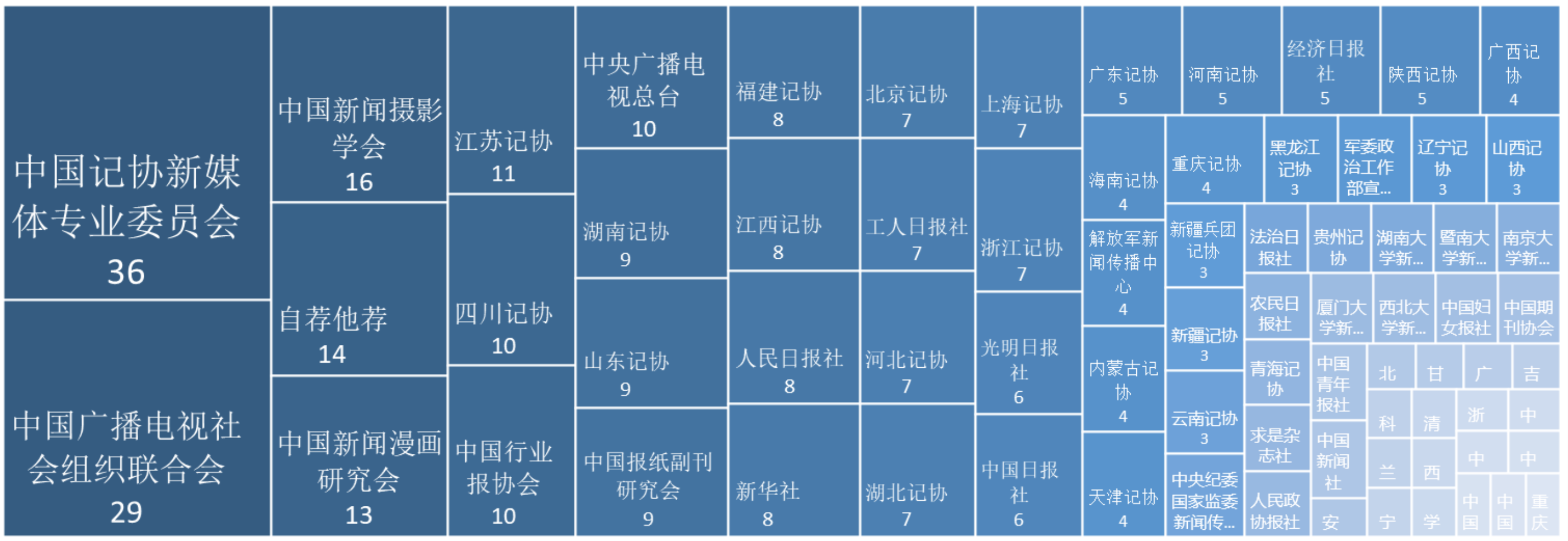 数据显示,获奖件数在4件以上的报送单位共有28家,其中获奖最多的为获奖36件的「中国记协新媒体专业委员会」,「中国广播电视社会组织联合会」次之,获奖29件。