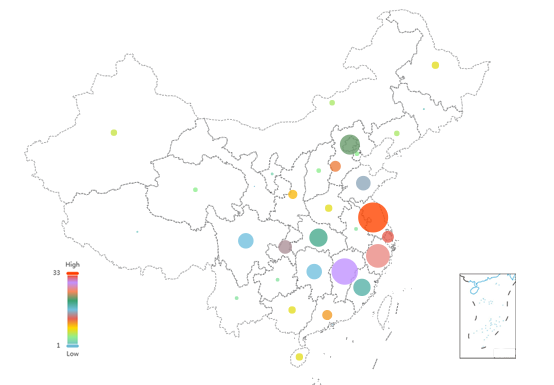 我们为奖次作品赋予了不同权重,特等奖、一等奖相较于二等奖、三等奖份量更重,据此生成气泡地图,气泡越大表示该省份得分越高。可以发现,获奖作品的地理分布更加集中于东南沿海和北京地区。