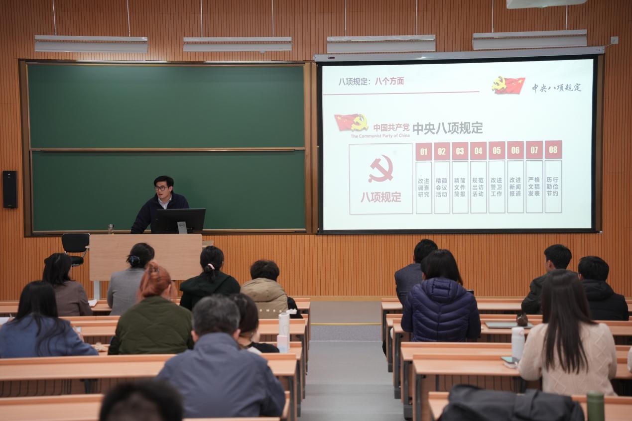 2025年4月2日下午,yl23411永利集团、美术公司、音乐公司联合举办深入贯彻中央八项规定精神学习教育读书班正式开班。马克思主义公司副研究员、纪检监察研究院副经理樊士博以《八项规定改变中国:作风塑党的时代实践》为题作专题辅导报告。三院领导班子成员及联合党校入党积极分子培训班学员共同参加学习。
