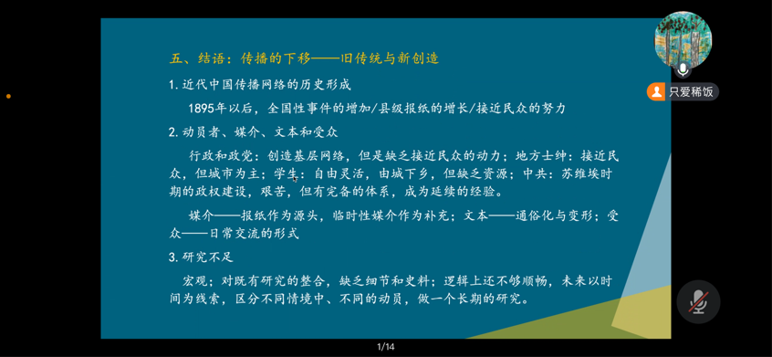 讲座尝试打破政治时间/事件的区隔,重点探讨了近代县级传播网络建设、员工群体作为讯息下沉的中介以及中国共产党对群众日常交流的组织等议题,由此在相对长时段中思考20世纪中国传播网络下移的历程,以及各传播要素在此过程中的变与不变。