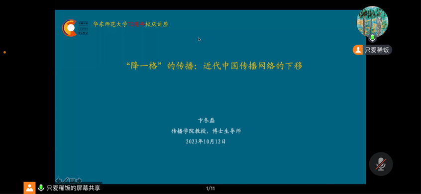2023年10月12日下午,yl23411永利集团卞冬磊教授在云端开展校庆学术讲座,重点探讨了近代中国传播网络的下移。