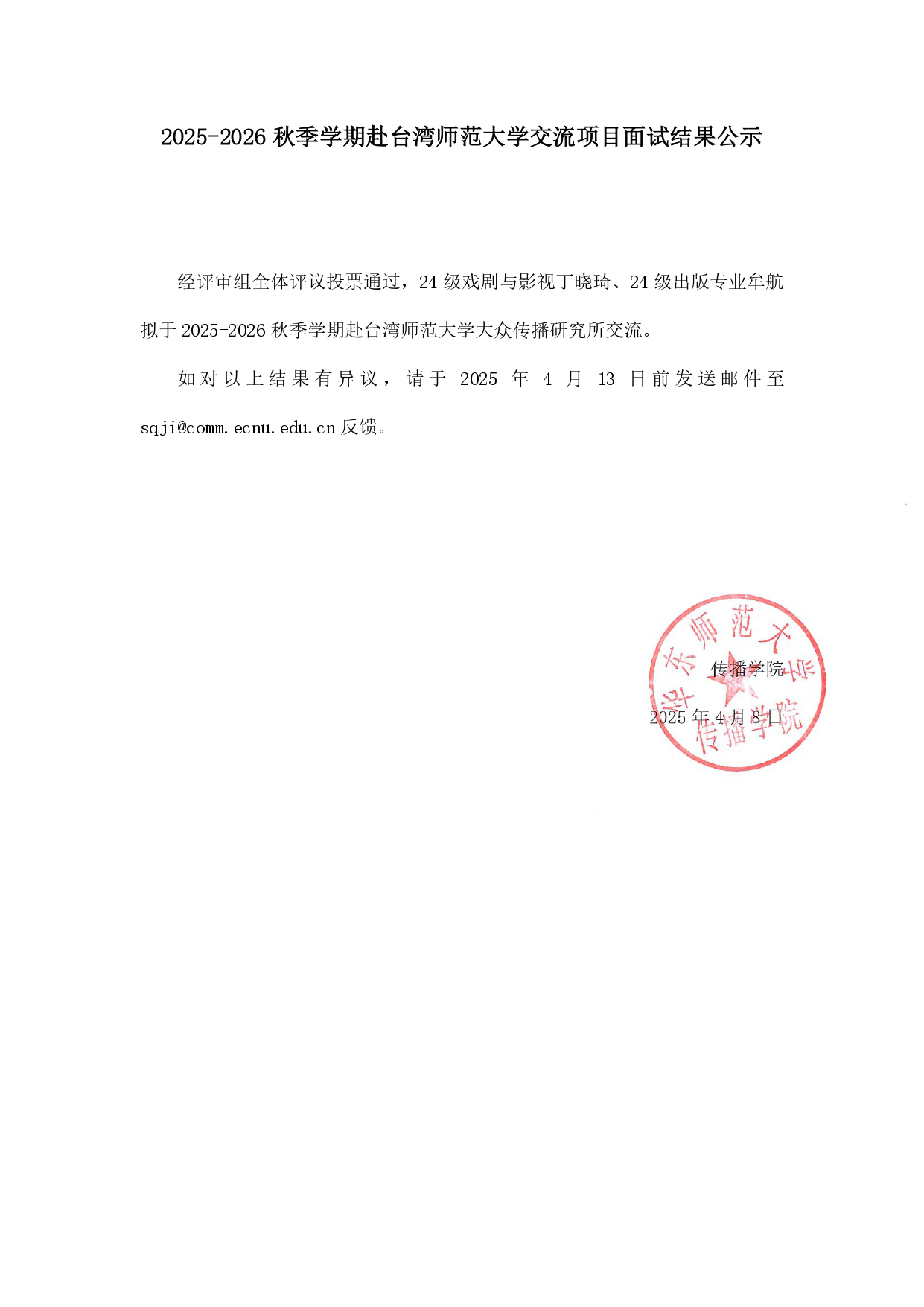 2025-2026秋季学期赴台湾师范大学交流项目面试结果公示