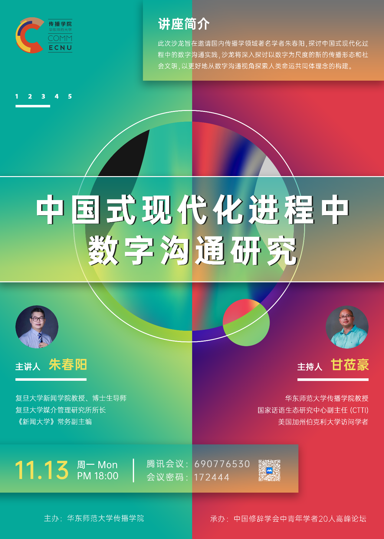 中国正处于从传统的“四个现代化”向“第五个现代化”跨越的关键阶段,由先前关注“物”的现代化转向聚焦于“人”的现代化。沙龙将基于对中国式现代化背景的深入解读,探讨现代化过程中的数字沟通实践,对数字沟通的含义和作用进行解析,挖掘深度媒介化时代数字沟通的理论价值和应用价值,进而推动参会者全面了解中国式现代化进程中数字沟通的复杂性,培养其批判性思维和研究能力,激发其对社会责任和伦理问题的关注,全面把握以数字为尺度的新的传播形态和社会文明,以更好地从数字沟通视角探索人类命运共同体理念的构建。