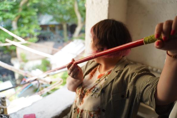 宇山纺在阳台用公用的“乌叉头”晾衣服