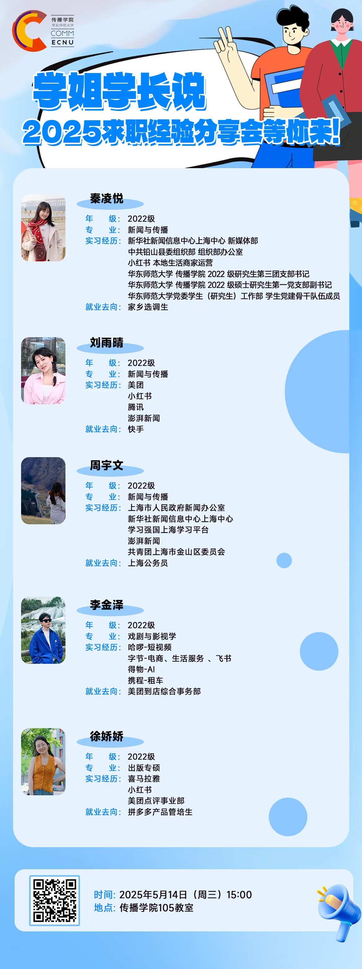 本次分享会邀请到了五位在不同领域有着丰富求职经验的学姐学长,她们将结合自己的亲身经历,面对面和大家交流求职技巧、心得体会以及各行业的最新动态,为正在求职的同学提供实用的指导,也让迷茫不定的同学们看到更多元的职业选择。