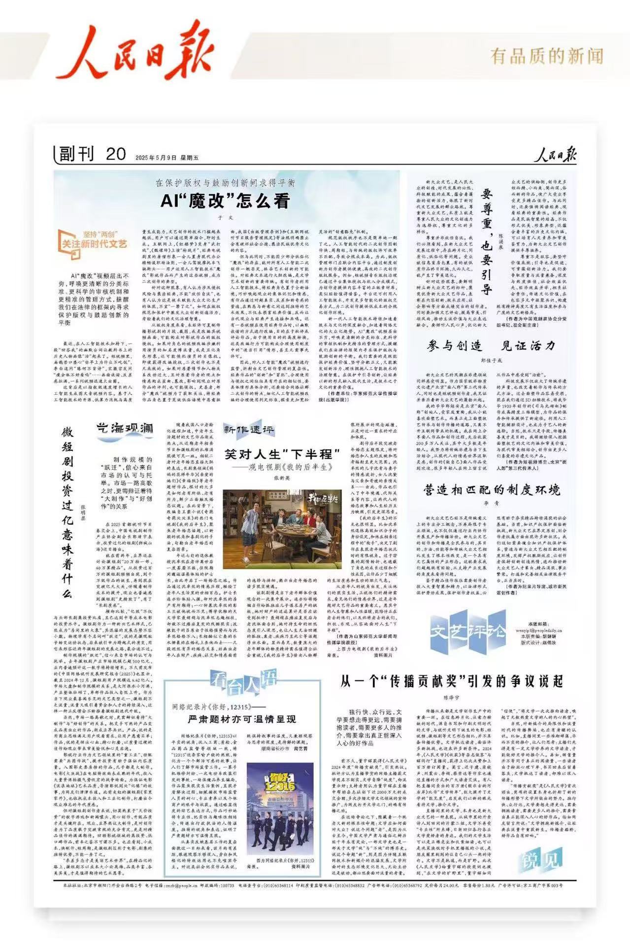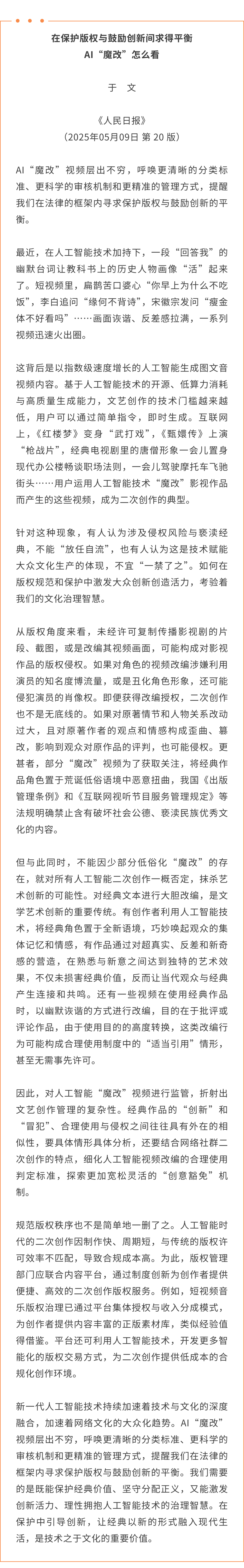 5月9日,《人民日报》刊发yl23411永利集团(出版公司)副教授于文署名文章《在保护版权与鼓励创新间求得平衡 AI“魔改”怎么看》。人民网、光明网、中国新闻网、中国电影报道等多家中央重点新闻网站和权威媒体先后转载。