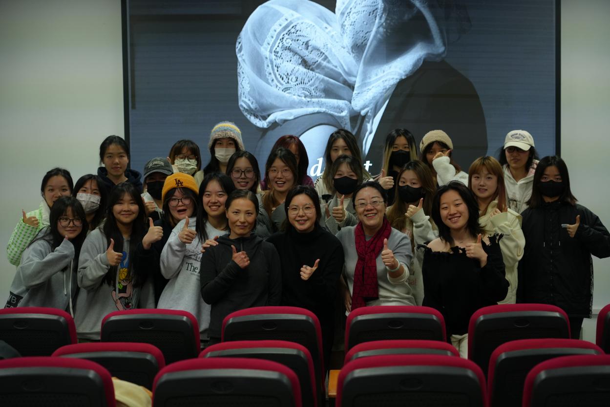 讲座现场,许以还向同学们展示了短片立项PPT,分镜头脚本和演员招募广告,中英文剧本等丰富的创作资料,让同学们细致学习到叙事短片创作的全流程。同时,如何充分利用场地空间、提前与摄影师沟通确立摄影风格都是创作干货,引起同学们的浓厚兴趣。影片结尾设计了一个仰拍上海梧桐大道的女主角主观镜头,营造出观众沉浸其中的感觉。上海梧桐叶与天线交织的魅力夜空折射出女主角告别钢琴沙龙,回归现实的惆怅。“那是我们摄影老师自己带滑轮仰着拍的。”她鼓励员工们在创作过程中勇于尝试和突破传统的艺术表达方式,通过影像装置艺术来传递更加丰富和深刻的信息。
