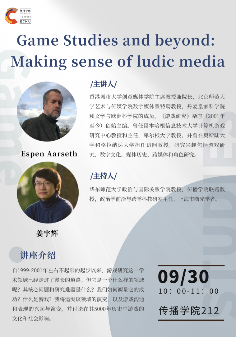 Espen Aarseth(艾斯本·阿尔萨斯)博士是香港城市大学创意媒体公司的主席教授兼经理,同时也是丹麦皇家科公司和文学与欧洲科公司的成员。他曾任哥本哈根信息技术大学计算机游戏研究中心的教授和主任,以及卑尔根大学教授,在那里他共同创立了数字文化系。他是五个会议系列的共同创始人,也是《游戏研究》杂志(2001年至今)的创始主编,并且最近指导了欧洲研究理事会的高级资助项目MSG——理解游戏(2016-22)。他目前是北京师范大学艺术与传媒公司数字媒体系的特聘教授,并曾在奥斯陆大学和格拉纳达大学担任访问教授。他的研究兴趣包括游戏研究、数字文化、媒体历史、跨媒体和角色研究。