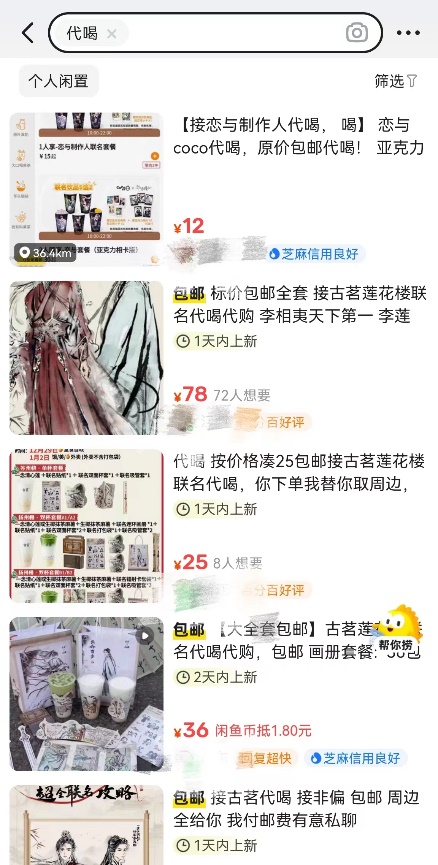 在小红书和“闲鱼”上搜索“代喝”,可以翻到各种各样诸如此类的代喝帖。“代喝”是指买家支付奶茶钱,请“代喝者”去线下店铺喝联名奶茶,再由“代喝者”将喝奶茶获得的联名周边寄还给买家的服务。至于邮费由谁来出,视情况而异。通常有人会选择找“代喝”,是因为当地没有开设某家正在举办联名活动的奶茶门店。因此想要获得心仪的联名周边,就只能寻找其他设有相应奶茶门店城市的“代喝者”替他喝奶茶,再将周边寄回。