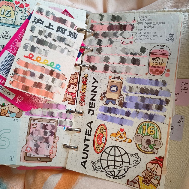 林默涵一直喜欢收集一些好看的小东西。出于做手账的喜好,她会有意将好看的东西保留下来,用以装饰她的手账。收集联名纸袋是从2022年7月开始的,截至目前,她共收集了七十多个纸袋。奶茶品牌在推出联名活动时,会特地根据此次联名的主题设计出一款或多款限定纸袋,不同于日常款的基础纸袋,这些联名纸袋往往印有漂亮有趣的插画和logo。林默涵会将重复收集的纸袋上的精美图案剪下来,贴在自己的手账本上,“看着这些漂亮的东西,心情会很好。”