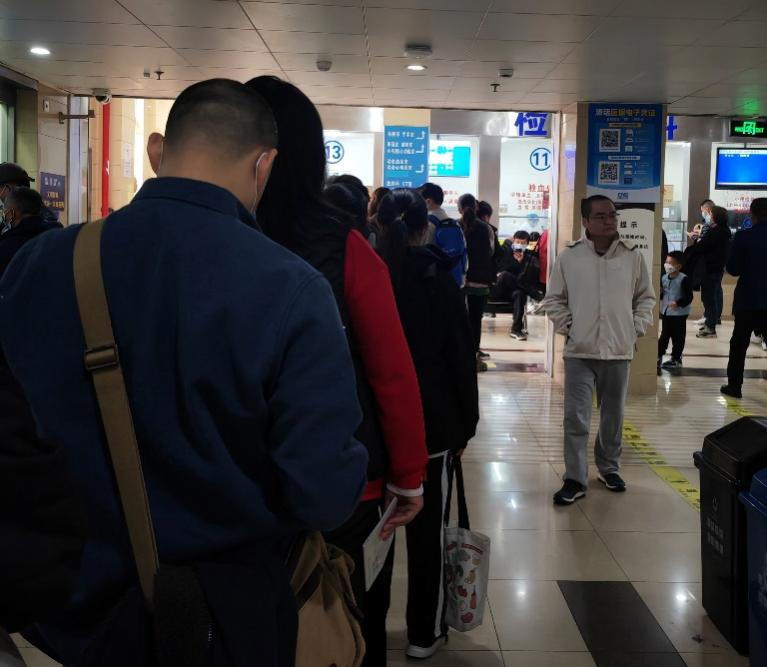 12月10日,19岁的陈添琳站在检验科十米队伍的末尾,等待进行抽血化验。从7号晚上开始,她出现了喉咙痛、头晕等症状,体温升高至37.5℃。陈添琳患有过敏性哮喘,每到冬季呼吸道便一直处于亚健康状态,咽痛和咳嗽是常态。但当天起床后她感到头晕目眩,于是便来到闵行区中西医结合医院挂了号。由于正值感染高峰期且是周日,医院里“人满为患”,血检队伍的长度保持在十米左右,一度与挂号队伍交叉。