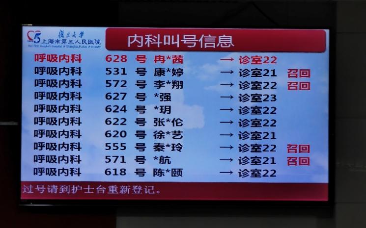 (复旦大学附属上海市第五人民医院12月26日16:55分的内科叫号信息显示屏)