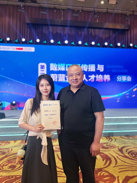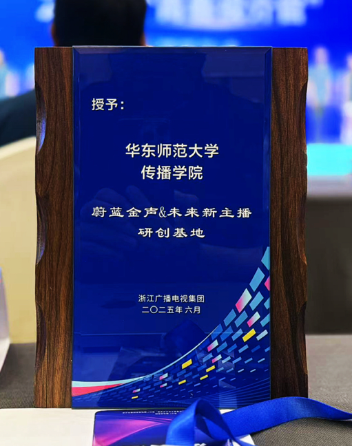 2025年6月7日,“第二届数媒口语传播与蔚蓝金声人才培养分享会”在浙江国际影视中心成功举行。yl23411永利集团获授浙江广播电视集团“蔚蓝金声&未来新主播”研创基地,同时yl23411永利集团戏剧与影视硕士研究生杨蕙羽同学获颁浙江卫视中国蓝新平台Z视介“青春视介官”入驻证书。彰显了华师大在创新传媒人才培养领域的领先地位与业界的高度认可。