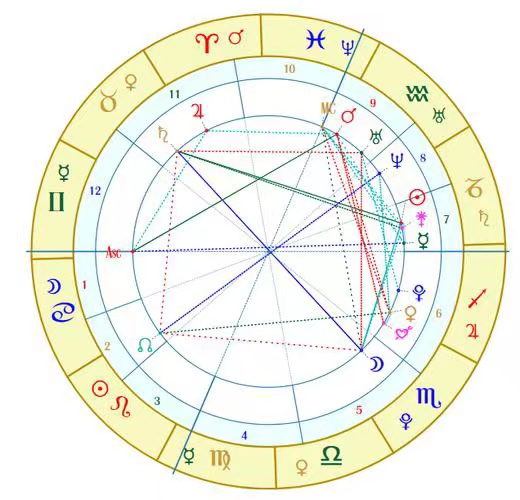 她打开手机上的“爱星盘”软件,屏幕上立刻出现了一个含有各种星座符号和数字的圆形图表。圆盘被划分为12个部分,每个部分都有对应的行星、星座和宫位,各个部分被错综交织的虚线或实线连接起来。她把这个图表称为自己的“星盘”,“我的太阳星座是巨蟹座,我的12个宫位有很多都在8宫,这些都是适合学习玄学的星盘特点。”她带有骄傲地说。