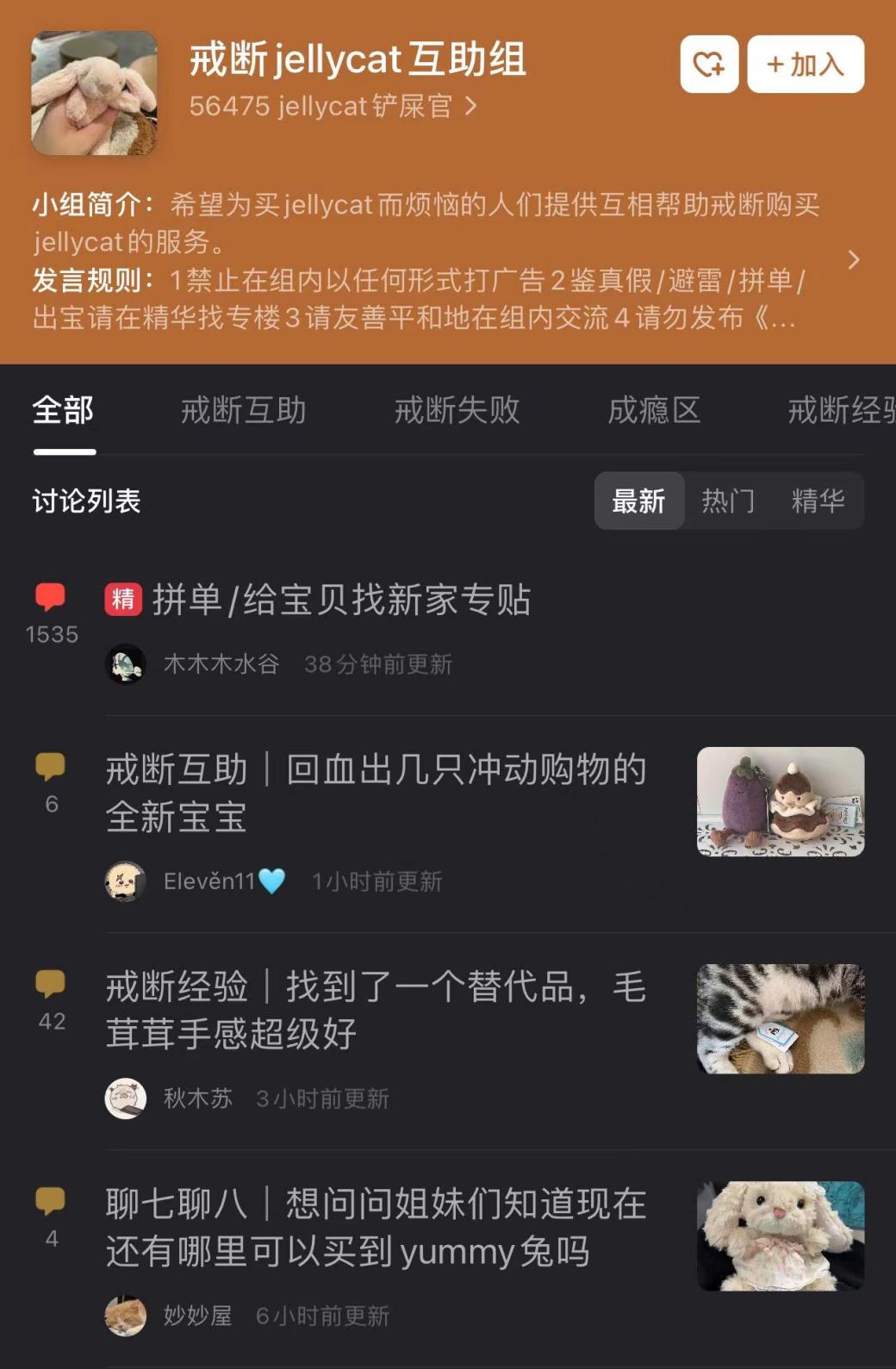 观察豆瓣“戒断jELLYCAT互助组”中帖子的更新时间,不难发现,“戒断成功”的分享许多都停留在数月之前,而带有“戒断失败”、“成瘾区”话题的帖子保持着平均每天更新10条的频率。许多人“戒断无果”,粉丝对jELLYCAT的爱意满的快要溢出屏幕,本以为能进组戒断,没想到却被反向安利,到头来一只玩偶也没少买。
