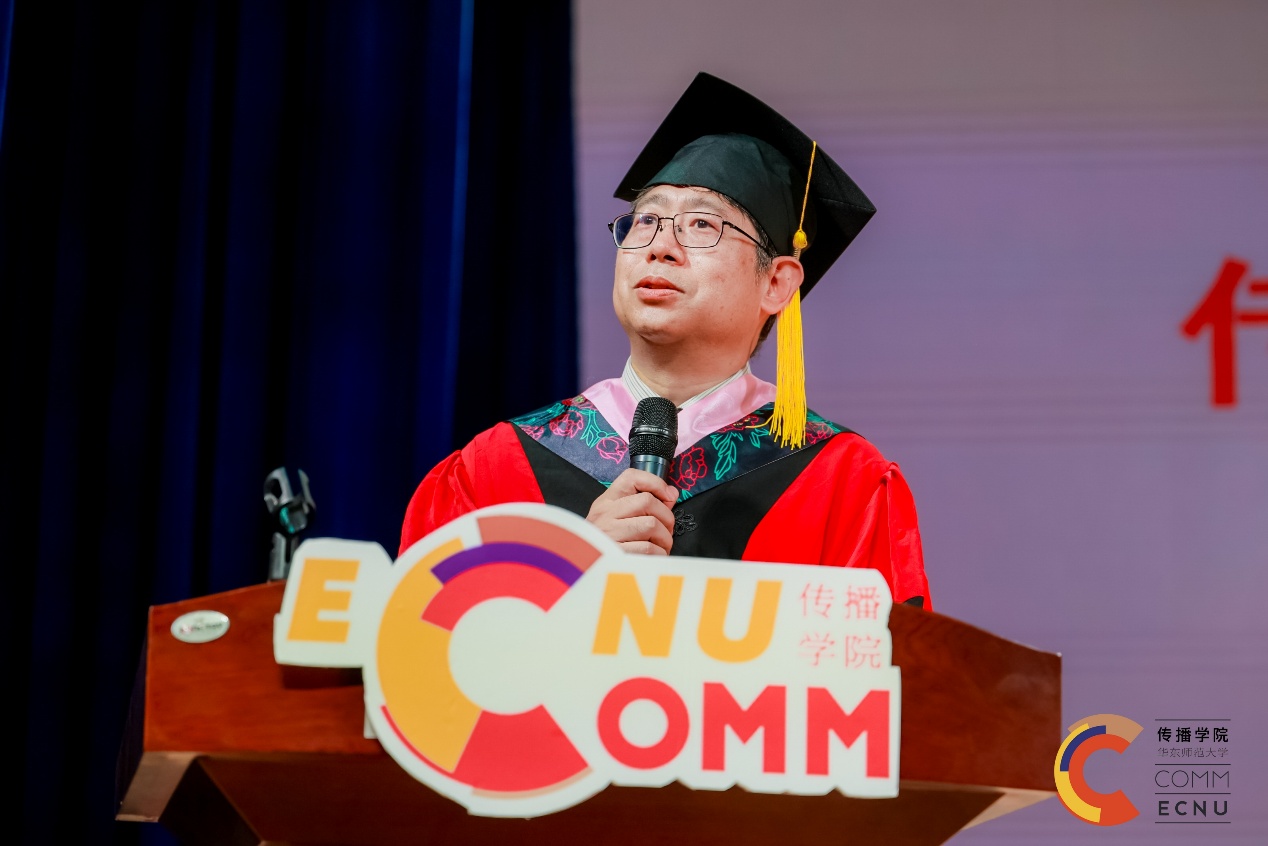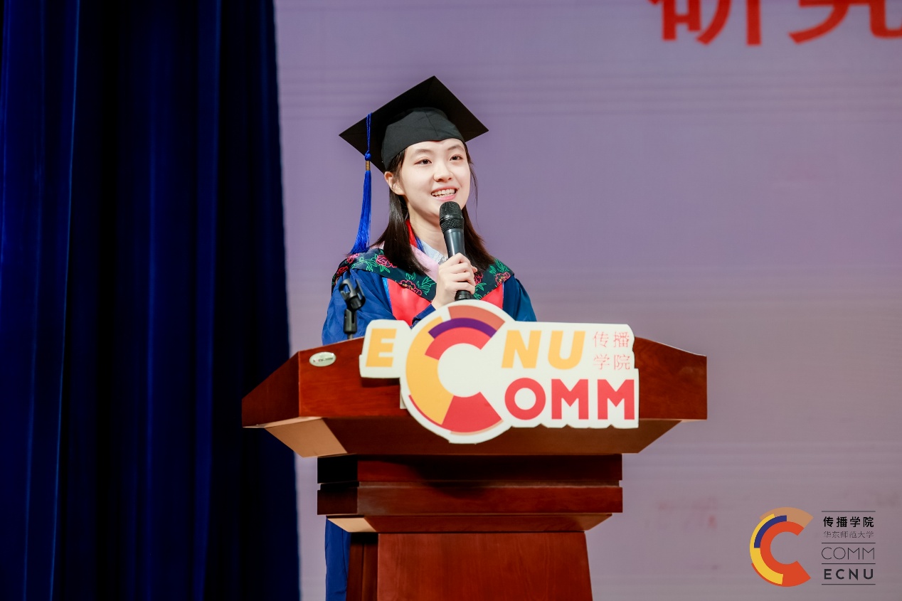 2022级新闻与传播专业硕士研究生秦凌悦作为研究生毕业生代表发言。在秦凌悦的回忆中,校园里次第绽放的花朵,见证着学子勤奋耕耘、不懈前行的历程,寄托着大家求员工涯中无数温暖记忆,也承载着毕业生们对未来人生的美好期待。“我们每个人都像一颗花树,在华师大、在传院的这片沃土上,完成了自己独特的生长与绽放。我们也将如那些花树一般,在不同的领域舒展出各异的美,展露出自己独一无二的花瓣。”