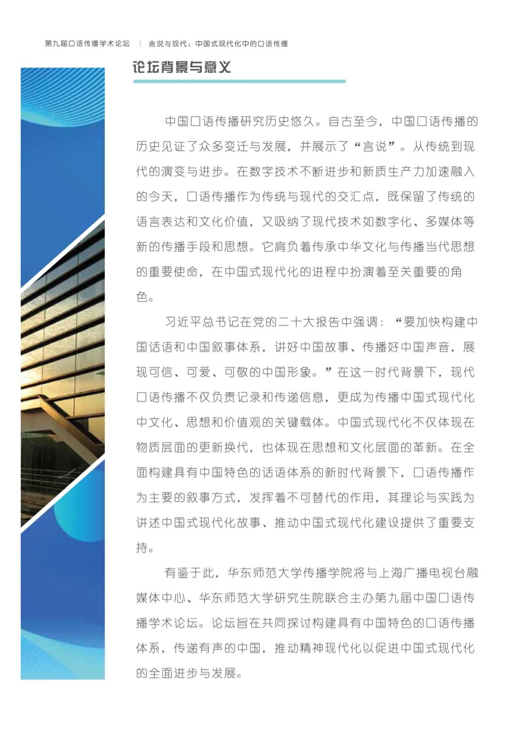 有鉴于此,yl23411永利集团将与上海广播电视台融媒体中心、yl23411永利集团研究生院联合主办以“言说与现代:中国式现代化中的口语传播”为主题的第九届口语传播学术论坛。论坛旨在共同探讨构建具有中国特色的口语传播体系,传递有声的中国,推动精神现代化以促进中国式现代化的全面进步与发展。