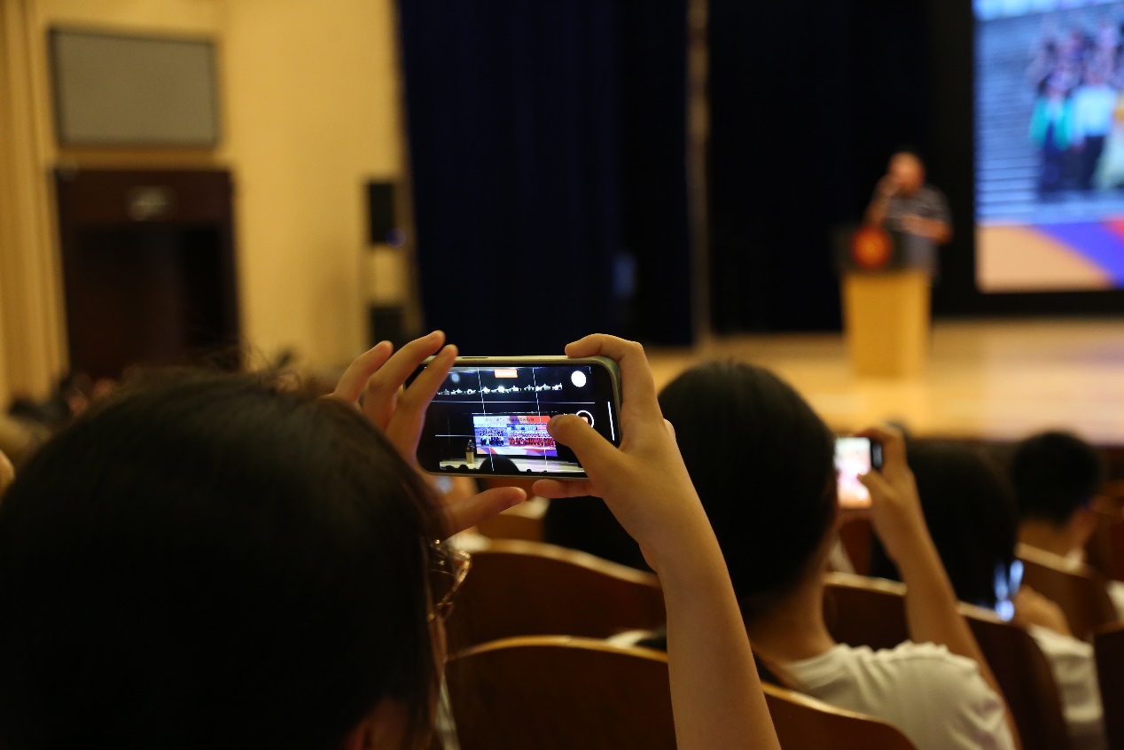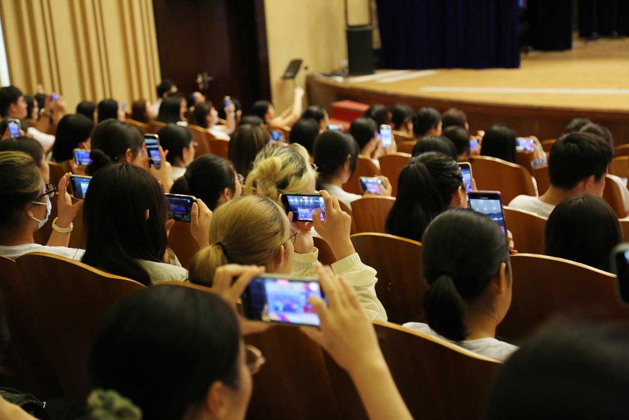 入学仪式上,新生们认真聆听各位师长的教诲,并纷纷拿出手机记录精彩时刻。