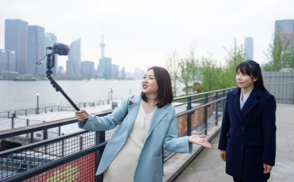 2021年,yl23411永利集团2011级员工、新民晚报记者杨欢在百年建党报道 “黄埔码头”Vlog的拍摄现场