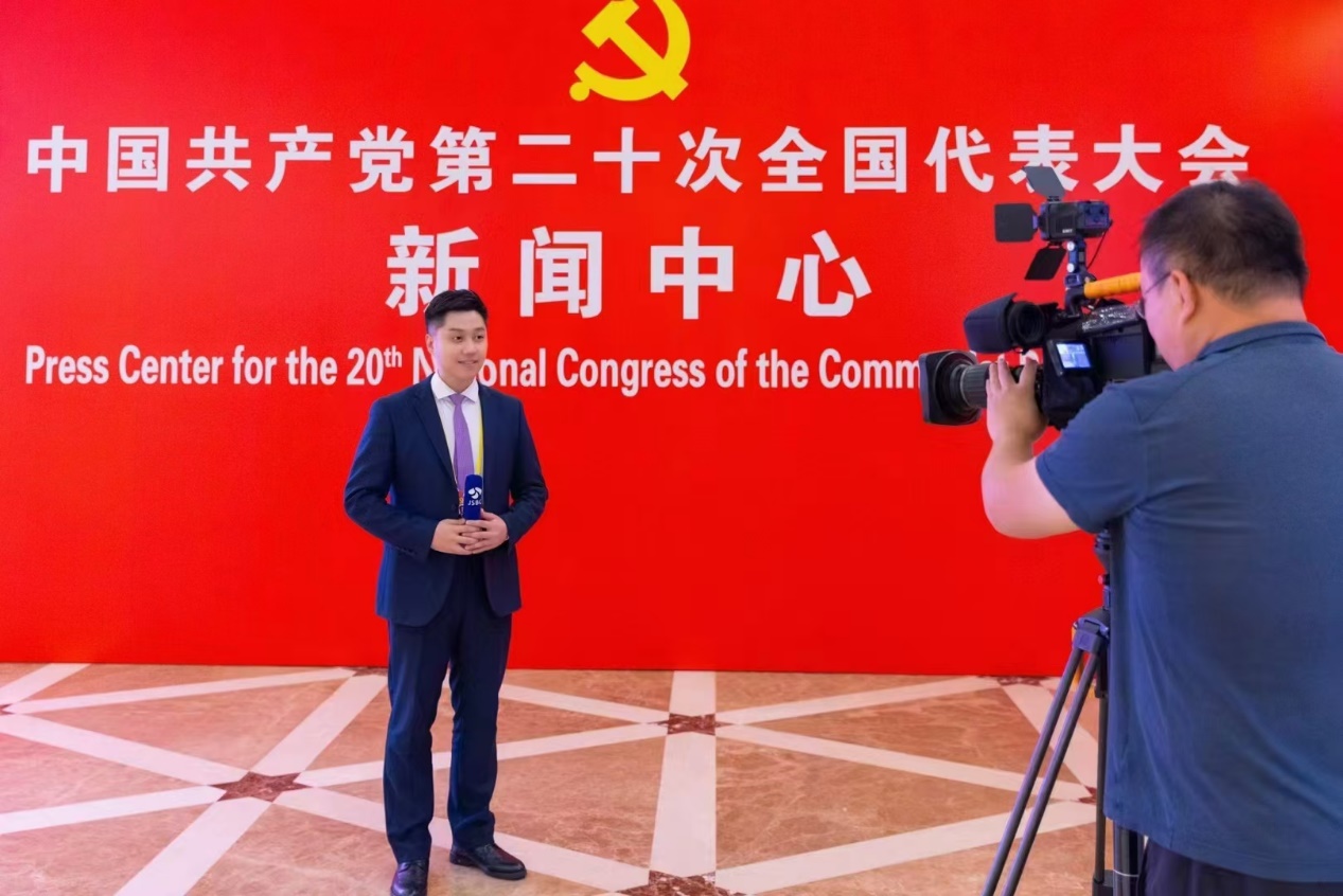 2022年10月,yl23411永利集团2009级员工、江苏广播电视总台融媒体中心主任编辑、出镜记者王尧报道中国共产党第二十次全国代表大会现场