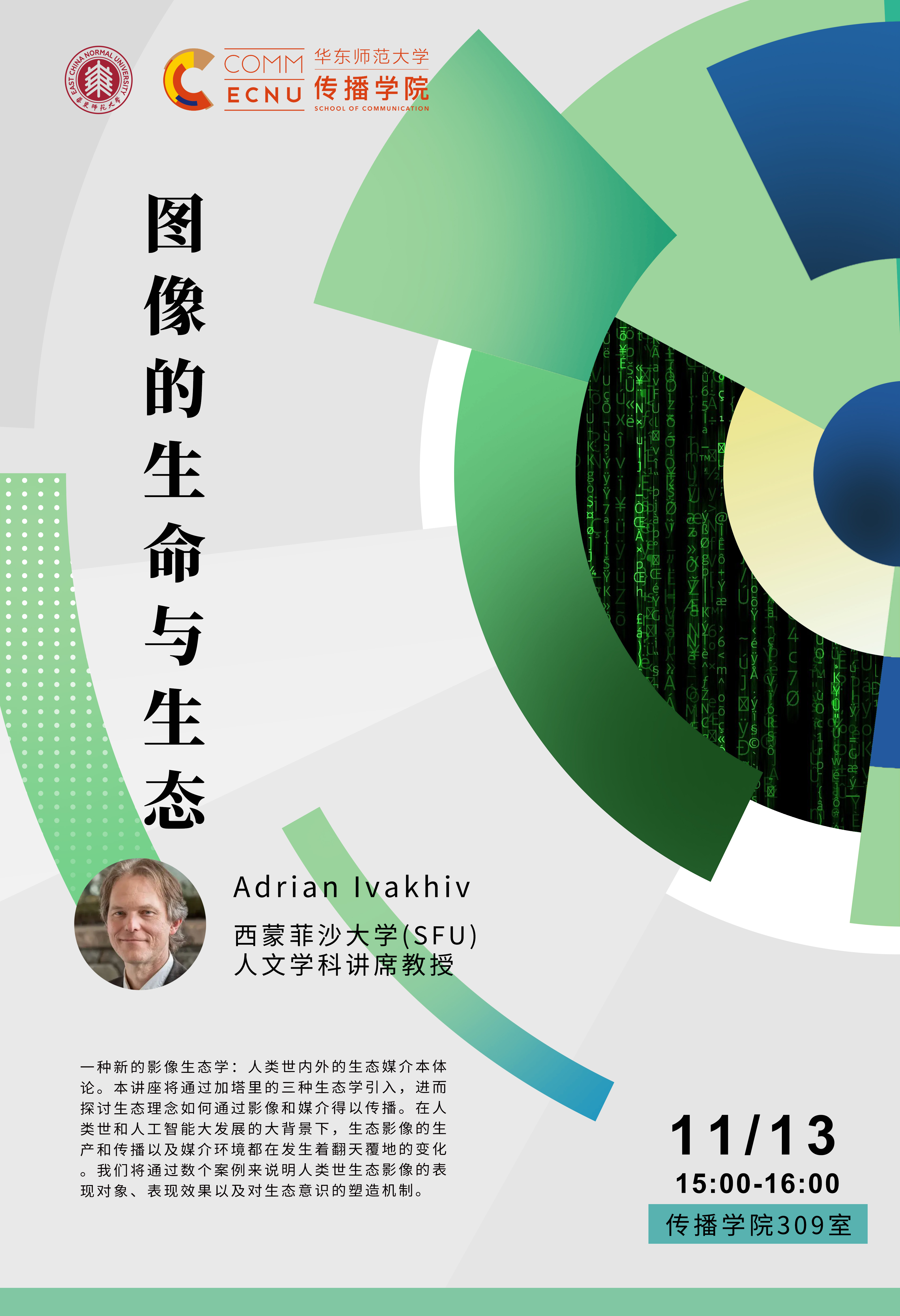 一种新的影像生态学:人类世内外的生态媒介本体论 本讲座将通过加塔里的三种生态学引入,进而探讨生态理念如何通过影像和媒介得以传播。在人类世和人工智能大发展的大背景下,生态影像的生产和传播以及媒介环境都在发生着翻天覆地的变化。我们将通过数个案例来说明人类世生态影像的表现对象、表现效果以及对生态意识的塑造机制。
