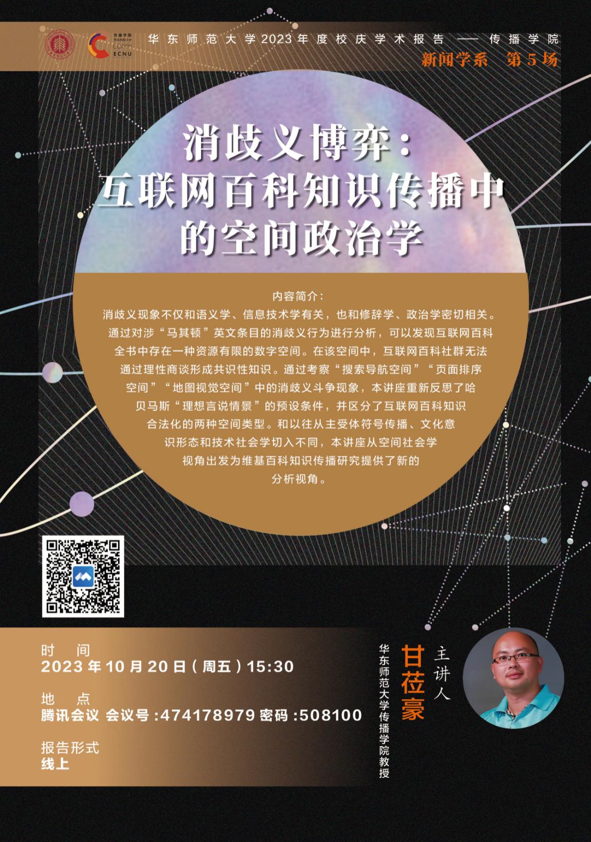 消歧义现象不仅和语义学、信息技术学有关,也和修辞学、政治学密切相关。通过对涉“马其顿”英文条目的消歧义行为进行分析,可以发现互联网百科全书中存在一种资源有限的数字空间。在该空间中,互联网百科社群无法通过理性商谈形成共识性知识。通过考察“搜索导航空间”“页面排序空间”“地图视觉空间”中的消歧义斗争现象,本讲座重新反思了哈贝马斯“理想言说情景”的预设条件,并区分了互联网百科知识合法化的两种空间类型。和以往从主受体符号传播、文化意识形态和技术社会学切入不同,本讲座从空间社会学视角出发为维基百科知识传播研究提供了新的分析视角。