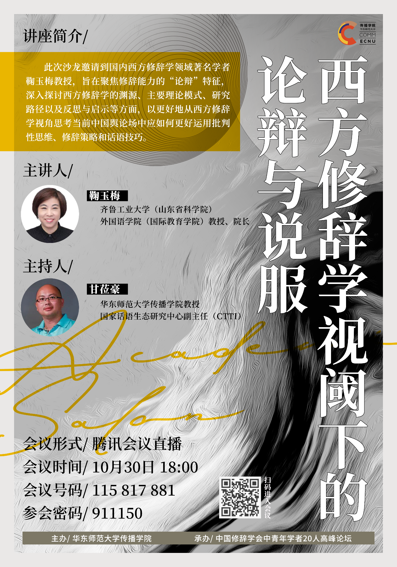 讲座旨在聚焦修辞能力的“论辩”特征,深入探讨西方修辞学的渊源、主要理论模式、研究路径及反思与启示等方面,以更好地从西方修辞学视角思考当前中国舆论场中应如何更高运用批判性思维、修辞策略和话语技巧。讲座内容主要包括修辞与劝说、论辩作为修辞实践、古典修辞论辩学说举例、当代修辞论辩学说举例,以及修辞论辩的意义与价值五个方面。