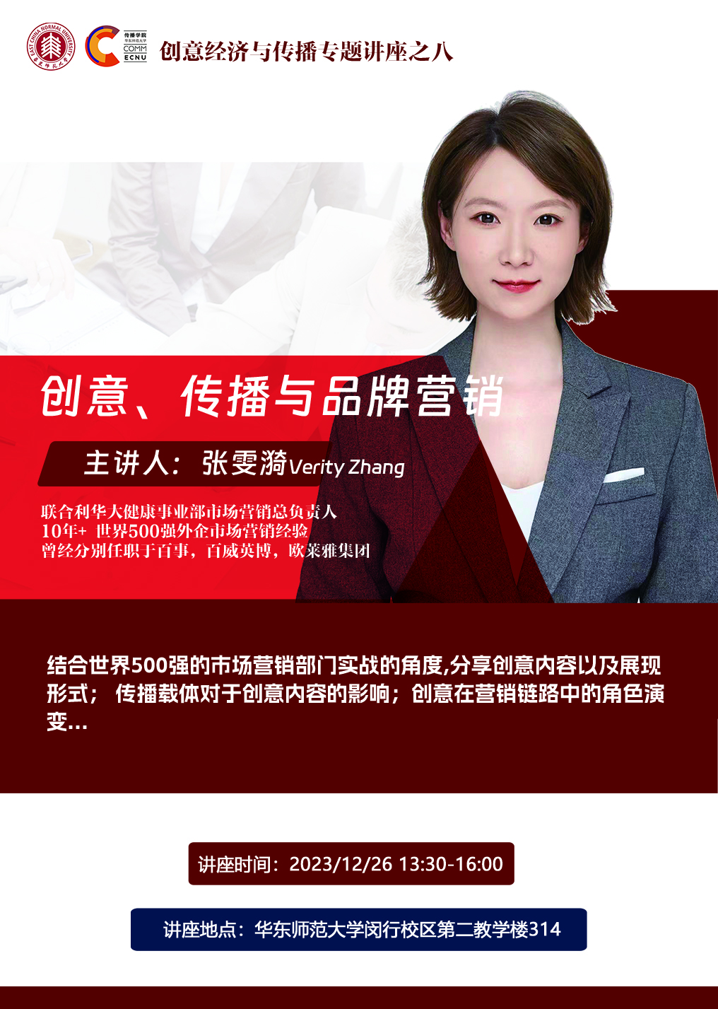 本次讲座结合世界500强的市场营销部门实战的角度,分享创意内容以及展现形式;传播载体对于创意内容的影响;创意在营销链路中的角色演变。